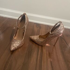 Elegant Rose gold sparkle heels with ankle strap. Perfect for evening wear.