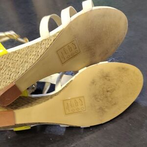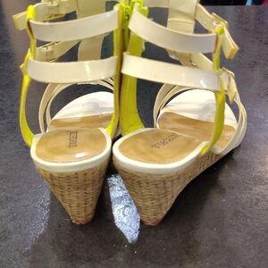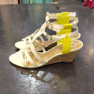 Shoe Dazzle Yellow and White Strappy Wedge Sandals