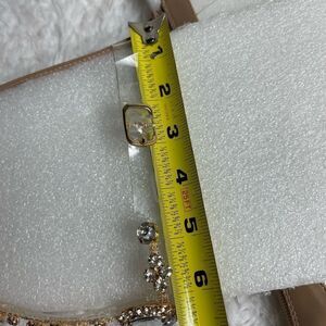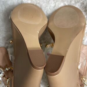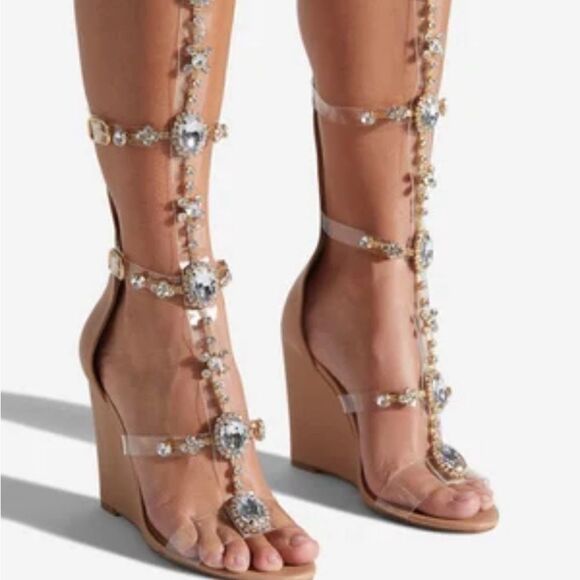 Shoe Dazzle Yulanda clear plastic and Nude faux leather Gladiator wedge sandals jewels&gold tone accents SZ8.5 back zipper. side buckles Pre owned in good used condition no noticeable missing jewels clean see all pictures any questions please message.