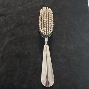 A unique vintage item for shoe lovers and collectors alike. This stainless-steel shoe horn and clothes brush combo from the 1960s is a rare find. The expandable design makes it perfect for travel, and it's made of a sturdy metal and wood material that is sure to last.