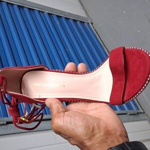 Chic red suede heels with lace-up design. Perfect for a stylish look.