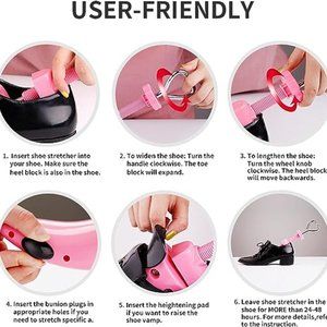 Super Easy to Use: Insert the shoe expander into your shoes with a heel block close to the heel and turn the knob clockwise quickly to stretch them to the desired length. Turn the lovely heart-shaped crank handle clockwise to expand them to the desired width. Please make sure to leave the shoe stretchers in the shoes for at least 24-48 hours. The longer you leave them in, the better the overall result.