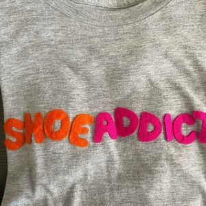 Shoe Addict Tee sold at ModCloth. This adorable short sleeve semi-fitted T-shirt has Shoe Addict in felt orange and pink letters on front, orange tab on left sleeve and solid back. Approximate measurements are 23.5 length and 19 armpit to armpit. Size Large. EUC
