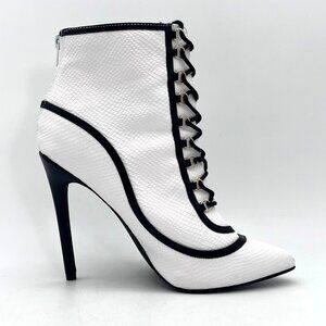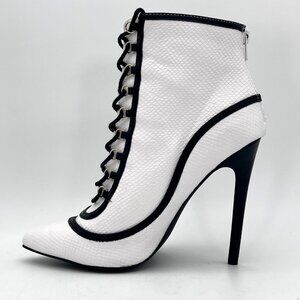 Crafted with a striking black-and-white design, these booties feature a lace-up front and a convenient back zipper for an adjustable fit and easy wear. The pointed toe and stiletto heel add a touch of sophistication, making them suitable for evening events and activities later that night!