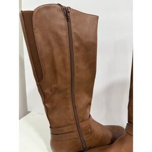NEW with tags. ShoeDazzle Reena flat knee-high boots in a brown snakeprint design. Features a tall shaft, inner side zipper, and lightweight flat outsole. Faux snake texture with a glossy finish. Women’s size 9.5.