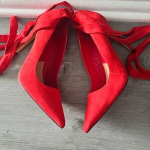 Elegant red pointed toe 4” heels. Features a stylish bow detail. Perfect for any occasion. Ships from a smoke and pet free home