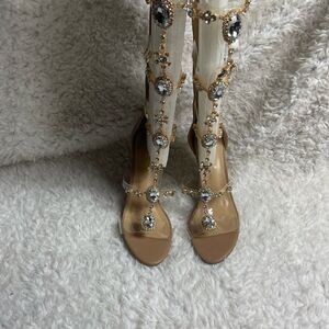 Shoe Dazzle Yulanda clear plastic and Nude faux leather Gladiator wedge sandals jewels&gold tone accents SZ8.5 back zipper. side buckles Pre owned in good used condition no noticeable missing jewels clean see all pictures any questions please message.