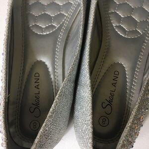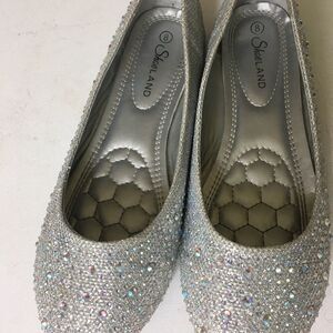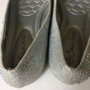 Shoe Land silver sparkly flats size 8 pre owned in good used condition minor wears around the cuff of the shoes and on stone is missing can hardly notice see pictures