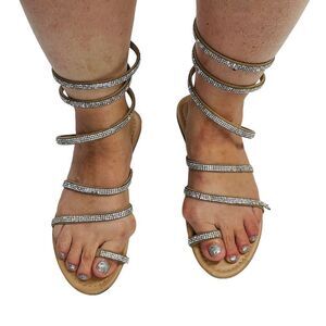 A flat sandal featuring a toe ring and embellished wraparound ankle straps.