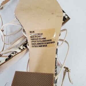 Shoedazzle Belva Strappy Block Heel Sandal Snake Print Size 10. A strappy sandal with a high block heel and side buckle closure.