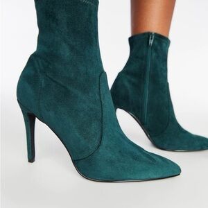 Step out in style this season in these sassy velvet sock boots. In a gorgeous Jewel green, they are perfect for the season ahead. The Shanae Stiletto Boot injects fresh style into a classic silhouette. Constructed from a timeless ankle boot silhouette with a pointed toe and a side zip fastening on the inner ankle. The Shanae introduces a trend of the season into this timeless design. A trendy flared stiletto heel steals the spotlight of this chic staple, creating an eye catching gaze. Pair Shanae with your work and weekend looks for classic style with a fashionable twist.