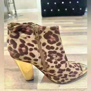 Shoe-dazzle Womens Bootie Boots Gold Cap Toe & Heel Leopard Print Sexy Size 7