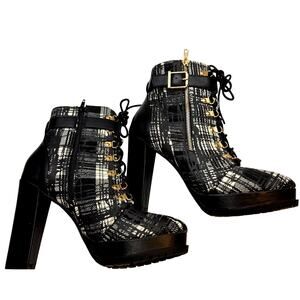 Shoedazzle Women's Shoes 10 Black Laces Closed Toe Ankle Boots Plaid Booties