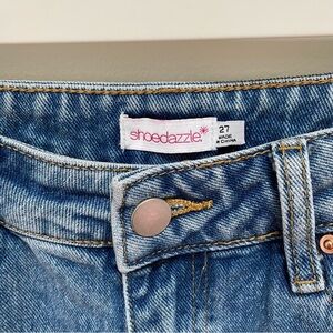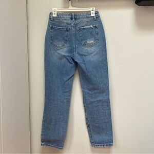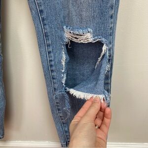 Super cute distressed mom jeans. Left leg has an exaggerated hole in the knee. Size 27. Denim has very little stretch.