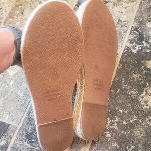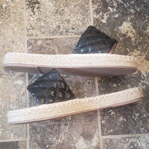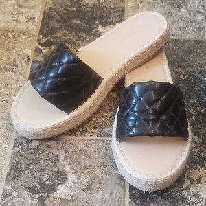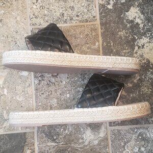 These shoes are an elevated slide with a quilted strap and raffia bottom. Never worn other than to try on. Size 10, in perfect condition.