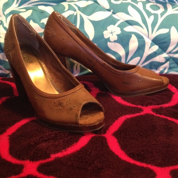 Brown Y-not? Heels embellished with flowers and gold circle stubs. Some wear and tear.