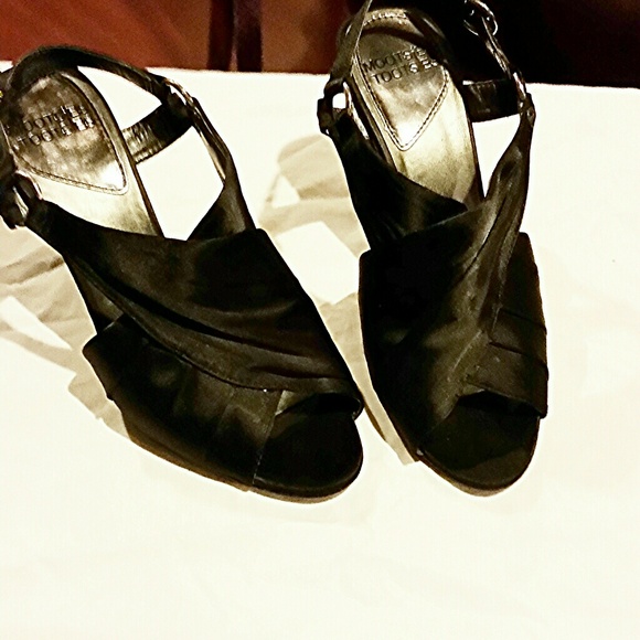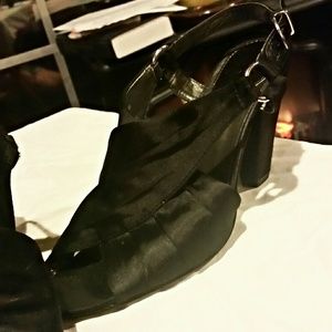 Black high heels. Very classy. Open toed, surprisingly comfortable! Gently used. Thick layered straps covering top of foot, wide heels. Size 6, but fits up to 7.5. Any questions feel free to ask! :)
