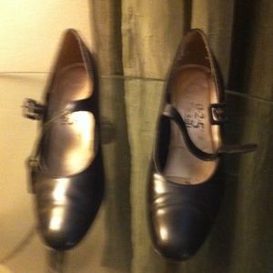 Black upper leather 2" heel work shoes. Worn but in good condition