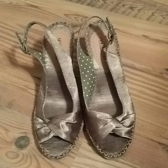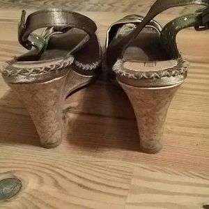 Perfect slingback wedge sandals. Only worn a couple of times with one outfit. Excellent condition. Almost no wear. The color is more of an olive green beautiful material.