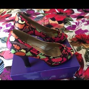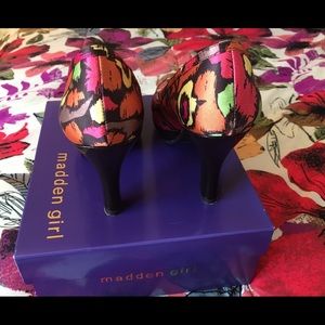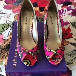 Beautiful Madden Girl Shoes - Satin/Floral Print/Open Toe/Black Patient Leather Heel (3&1/2") Size 7&1/2 - Worn only once!