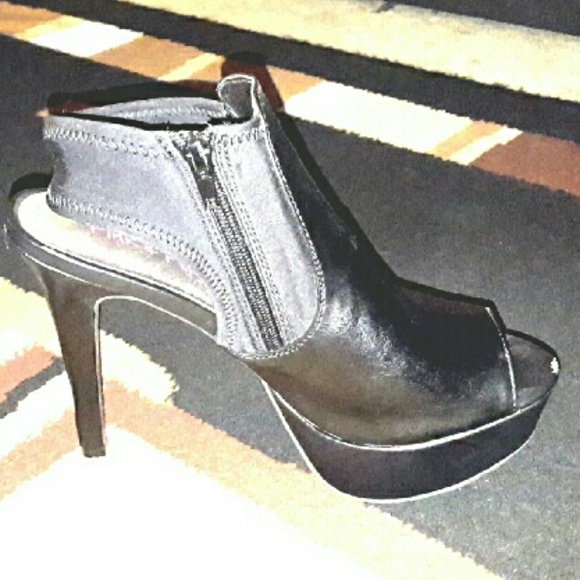 3" black spiked heel, with 1 1/2" platform soft elastic hugs your foot, zipper on side, worn a few times. Still in great shape.