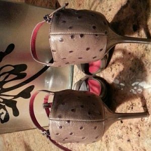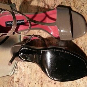Charles Jourdan Taupe Patent leather upper/ Ostrich Heel. Ankle strap with an adjustable buckle. It has a 4" spiked heel. These sexy things were very gently worn.