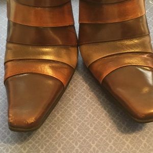 Sassy leather booties with 2" chunky heels. Pretty varying shades of brown allow these shoes to be matched to many outfits. Very comfortable to walk in. Typical signs of wear. See photos. Still have some life in them.