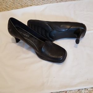 Black leather pumps