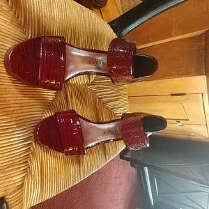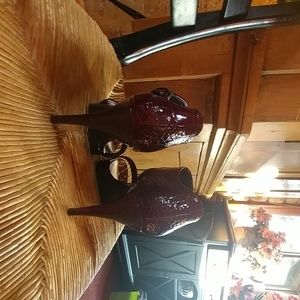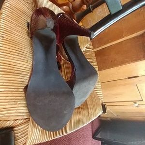 Red and black snakeskin heel, worn for party once, not too high, strap makes walking secure at normal speed