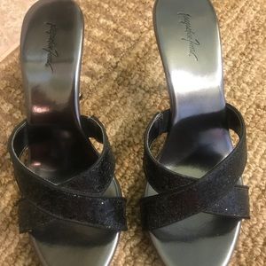 Beautiful dress shoes with black sparkling straps with clear heels. Only been worn once. Very comfortable to wear.