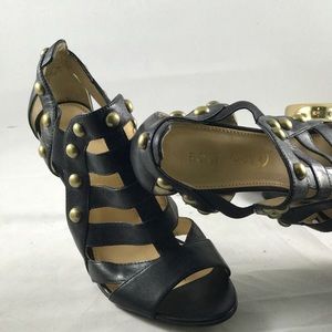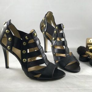 Black leather heels with gold nailhead detail
