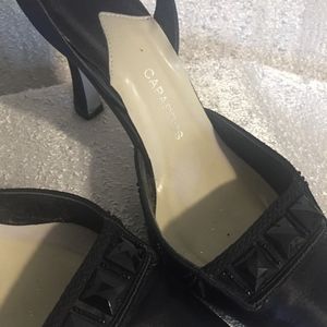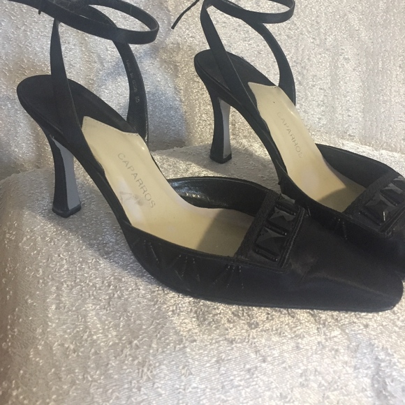 Black Satin Sling Back with thin ankle straps and 3" heel and black beaded design.