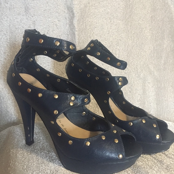 Studded Peep Toe with Ankle Straps and 4" Heel. (Dark Blue color)