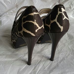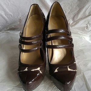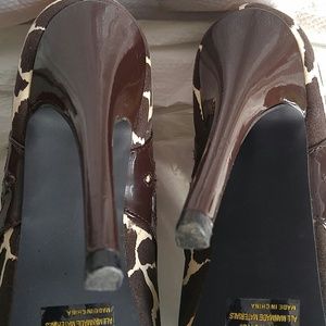 Shoes, Brown patent, platform heels, animal print glitter fabric uppers, adjustable 3 side snap closure, all manmade materials, 1" platforms with 5" heels, gently worn, excellent condition