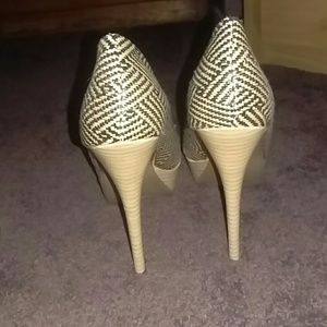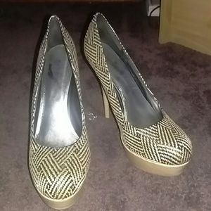 Never worn, tan and black weave design, 5 inch heel