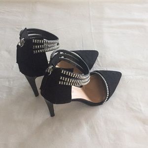 Black, suede, 4 inch heels with silver studded accents. Has black, stacked heel and zipper back. Try on ONLY, never worn, no box