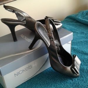 Pewter sling back hills,excellent condition in original box.