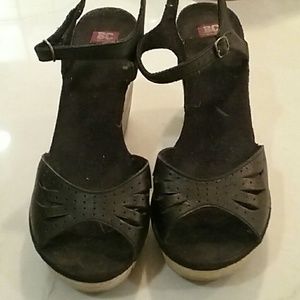 Black leather peep toe with plastic wedge heel. Worn a few times, excellent condition. Wedge is 3.5 inches. So cute!
