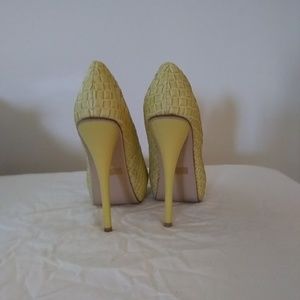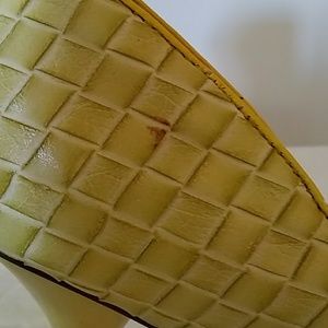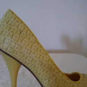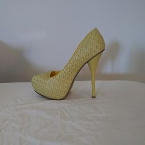 Great condition. Heel height is 5 1/2 inches. Has a woven pattern.