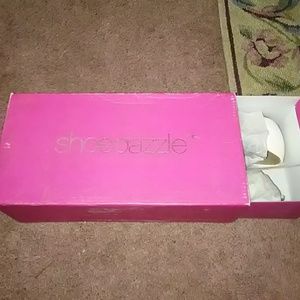 White with gold spike flats. Has peep toe. Only wore a few times. Has a little mark on it can be cleaned though. Will clean before sending if desired. Size 6 shoe.