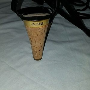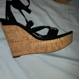 5 inch wedges that have material that ties around the ankle. Gold detailing.