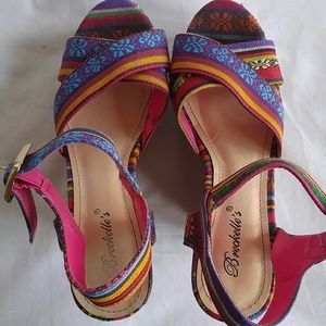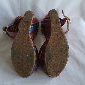 Shoes, colorful striped fabric wedge heel platform sandals, buckled ankle strap, gently worn good condition, 1.5" platforms, 5" heels