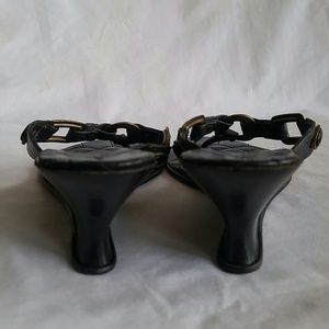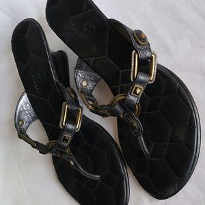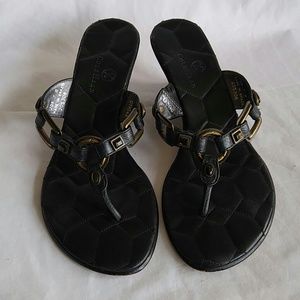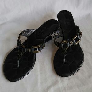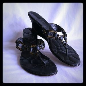 Shoes, wedge thong sandals with decorative gold bronze hardware and tiger eye stone accent, cushioned stitched insoles, gently worn excellent condition, 2" heels
