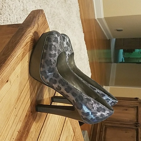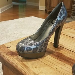 Silver leopard print high heels. 5 inch heel..2 inch platform. Never worn.