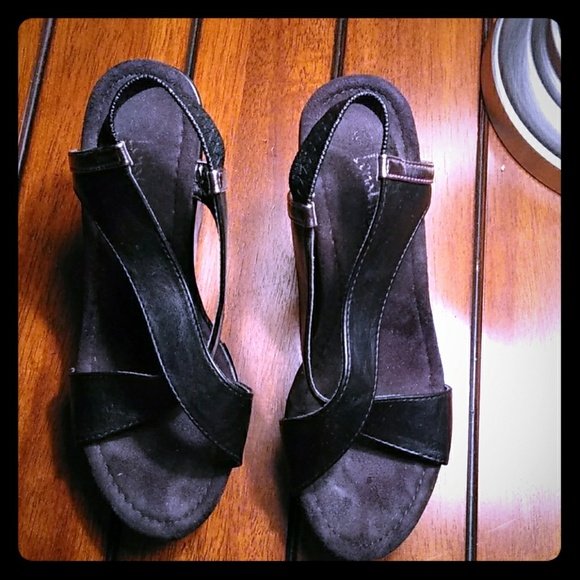 Perfect for a night out very comfortable black wedge with a touch of copper on the straps great condition.