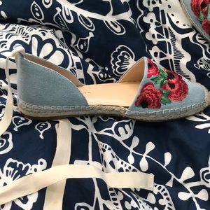 These are Denim shoes with a floral design on the top and bows in the back that you tie lightly like shoelaces! (NEVER WORN)