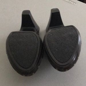 Brown, Leather and suede clogs with gold studs and buckles with 3 inch heels. Never worn size 7.5