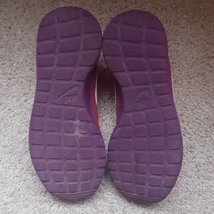 Purple base faded up to a deep pink color. Excellent condition, slightly worn. Very cute shoe that has a lot more miles go!