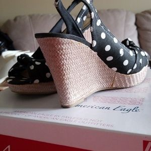 Polka Dot sling back wedge shoe. Peep toe canvas material.