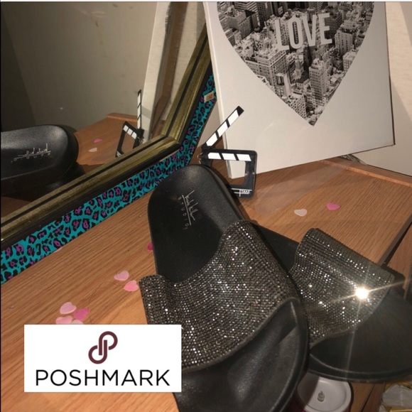Black and sparkly silver slides.